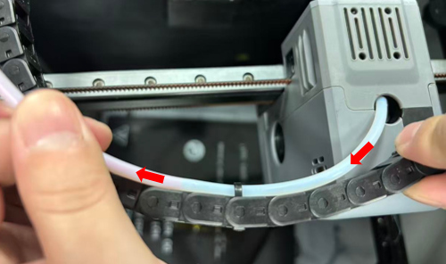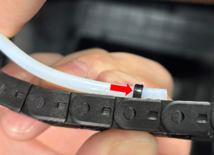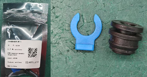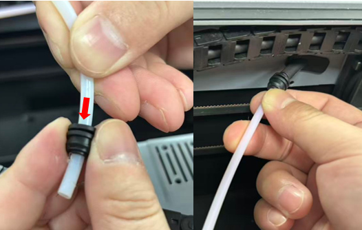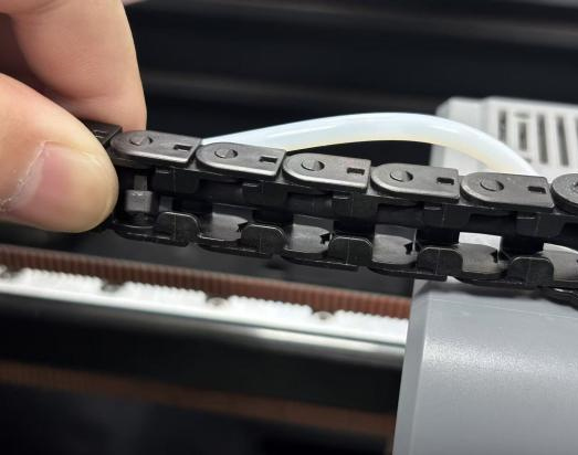 Hold the PTFE connector and push the PTFE tube to adjust the bending degree and height (to avoid affecting the subsequent material feeding effect), then install the PTFE connector clip to secure them.
