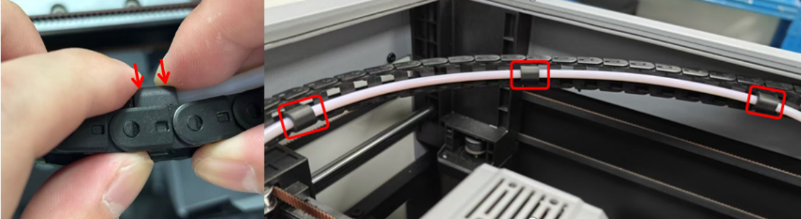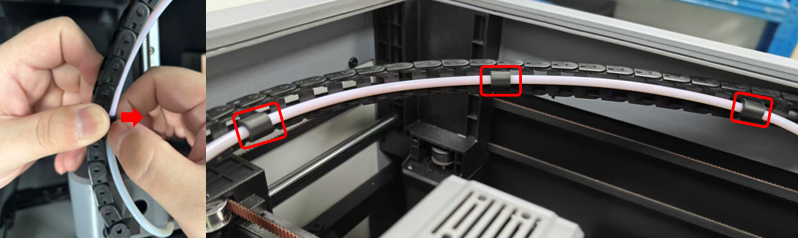 Secure the four PTFE tube clamps separately. Then, check whether the reserved length of the PTFE tube is appropriate. If the PTFE tube is pressed too low or not enough, readjust it according to step 3.