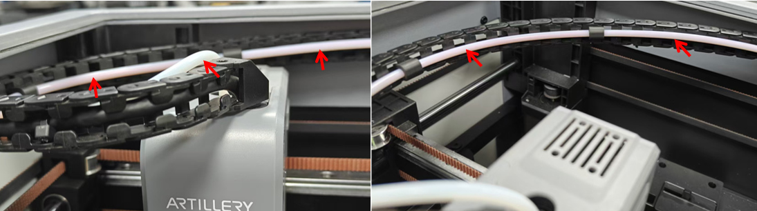 ⚠️Note: Move the single-nozzle to the bottom-left position and top-left position respectively, and check if the PTFE tube is installed in place.