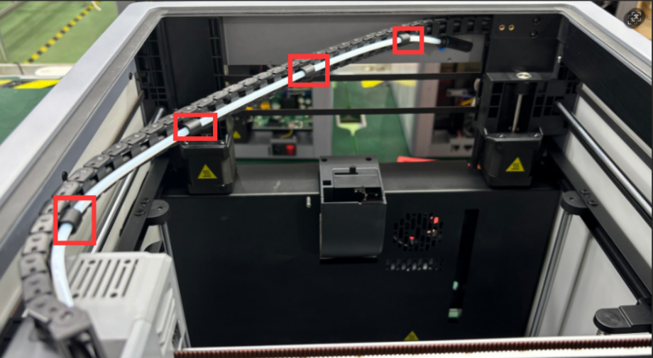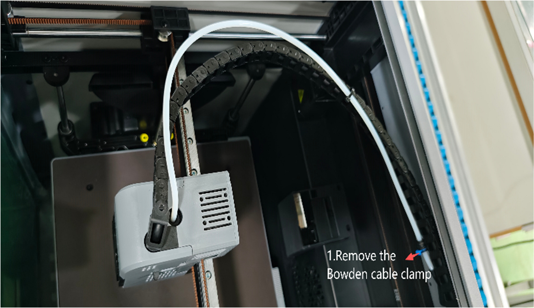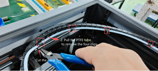 1. Use cutting pliers to cut the cable tie on the PTFE tube, and pull the PTFE tube to take out 4 buckles. Operate as shown in the figure.