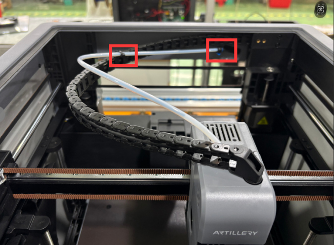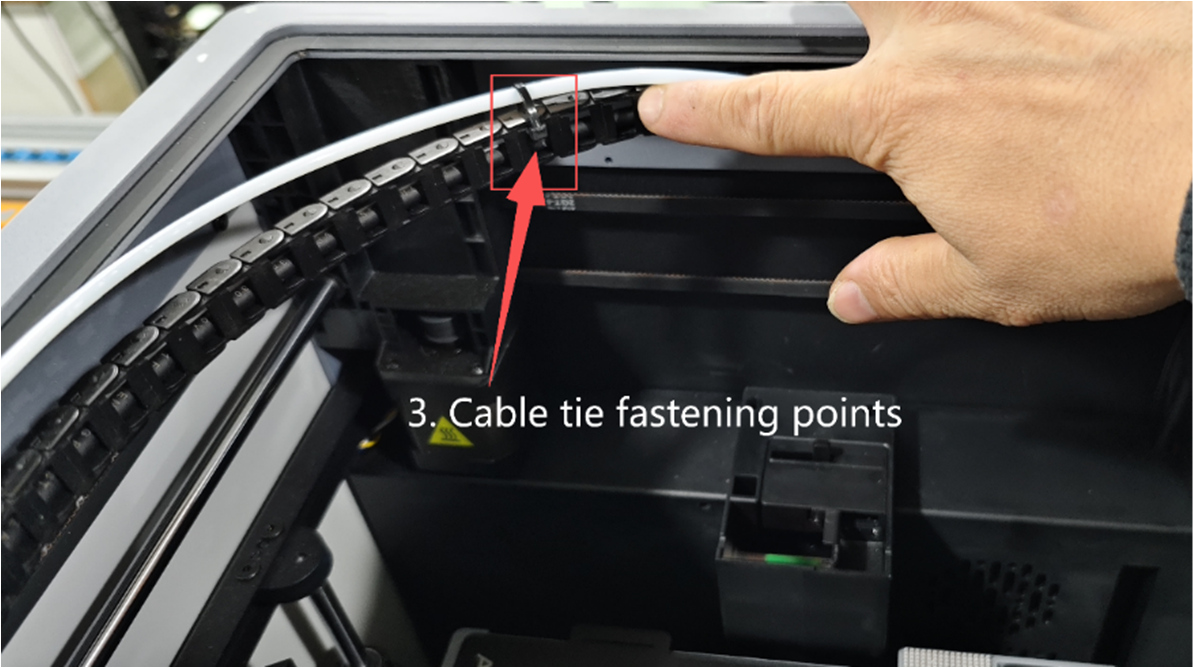 1. Press the drag chain backwards to fix the position of the lashing strap to ensure the range of motion of the drag chain, and the lashing strap will not interfere with or rub against the edge of the top frame. Use the lashing strap to pass through the drag chain hole to bundle and fix the PTFE tube. (Note: The lashing strap should not be tightened when bundling the PTFE, and a loose space should be reserved for the PTFE tube to move) as shown in the figure.