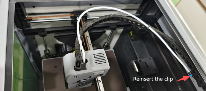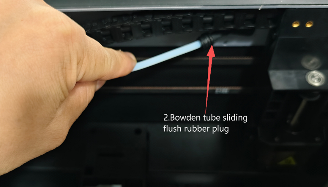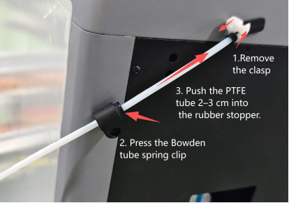 2. Remove the clip, manually press the Bowden tube seat spring, and insert the PTFE tube into the rubber plug direction for 2-3CM as shown in the figure.