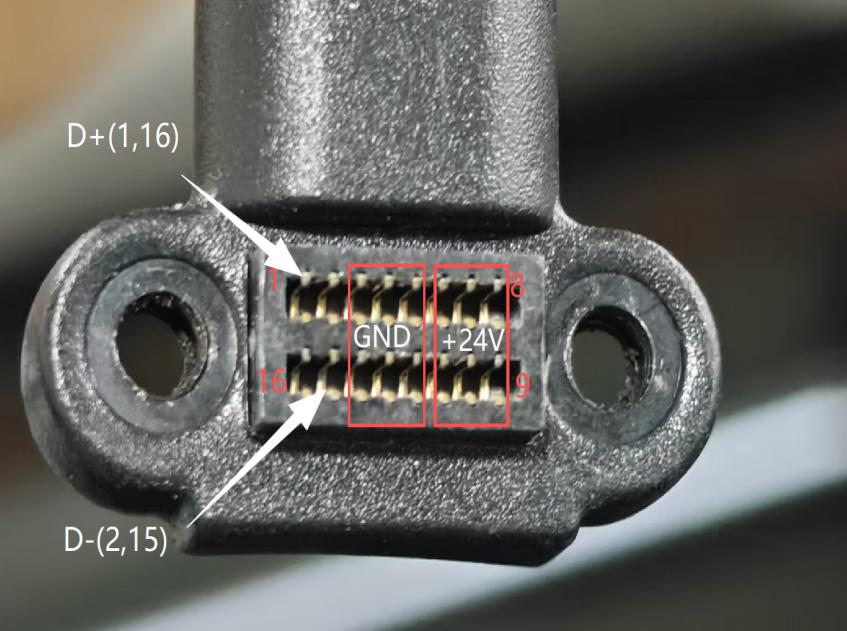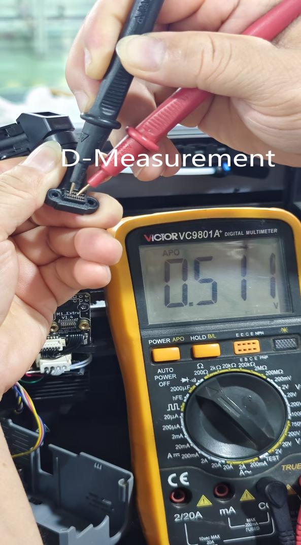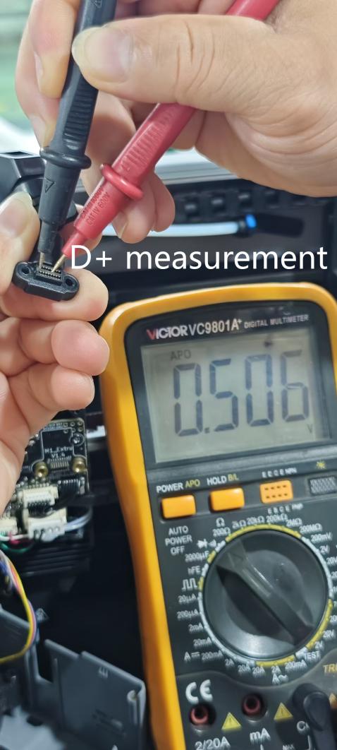 2. If the value becomes infinite or intermittent, replace the tool head cable to fix this issue. MCU “THR As shown, the correct measurement: the normal values for (D+ D-) are in the range of 0.50 V to -0.52 V. Note: Please perform measurements with the power off. During measurement, the black probe should measure D+ and D- respectively, with the red probe fixed to GND for the measurement.