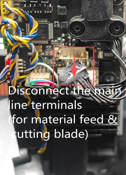 2.Please power off, unplug the material cut-off and blade connection ribbon ends, then power on again to check if the screen can display the temperature normally. If removing the connection as shown in the figure allows normal temperature display, it indicates an abnormality in the material cut-off and blade small board. (Please check the pins and cables of the material cut-off and blade small board connector seats)